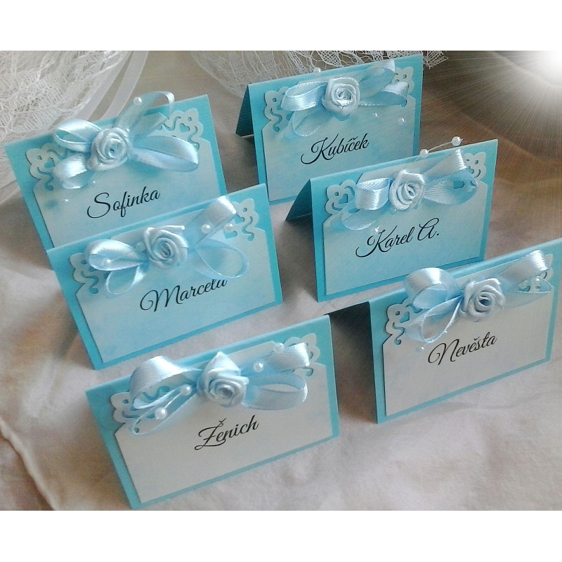 Svatební jmenovky s mašličkou, látkovým květem a perličkami.