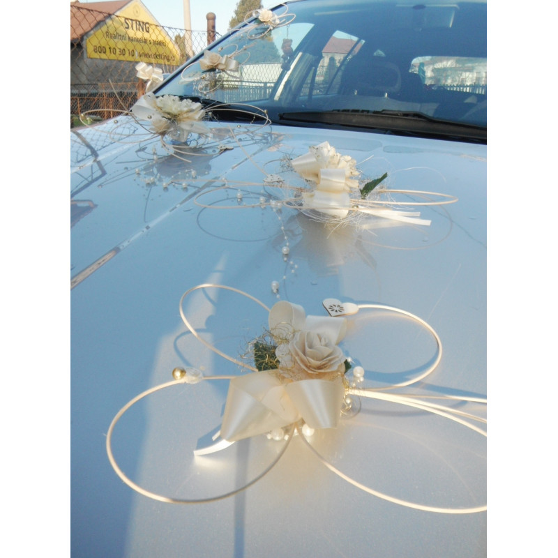 Výzdoba svatebního auta zahrnuje proutěné srdce, šerpu a dvě mašle na šerpu. Srdce je opatřeno...