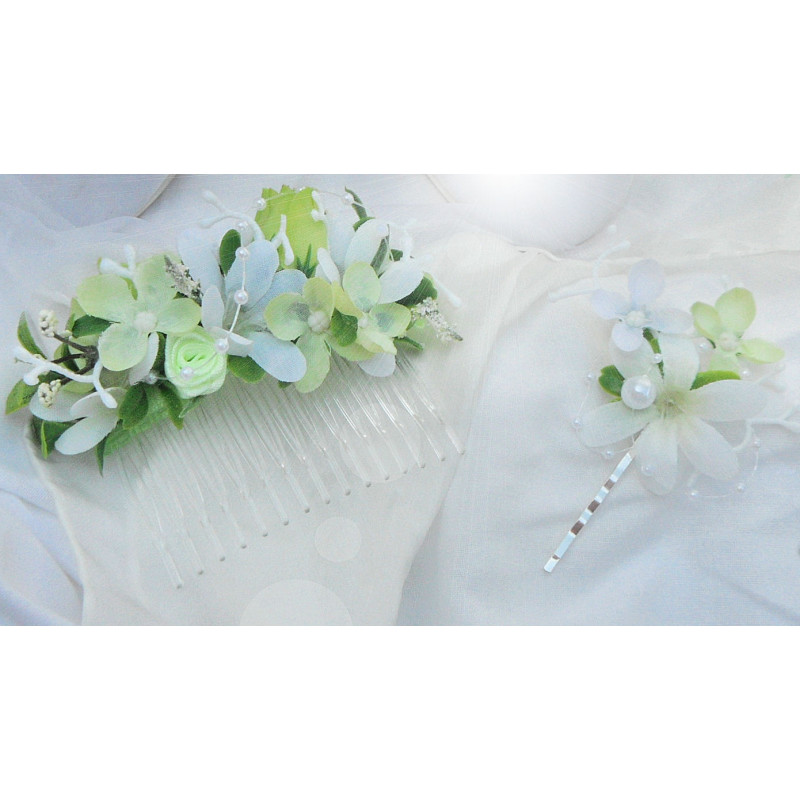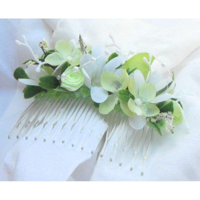 Průhledný hřebínek do vlasů s atlasovou stuhou,látkovými květinkami a perličkami.