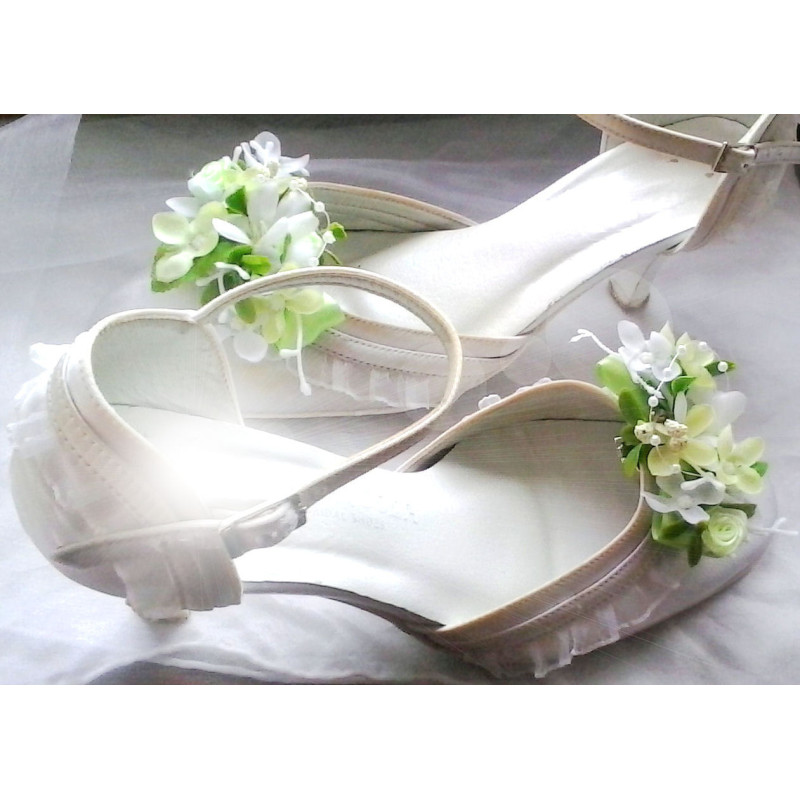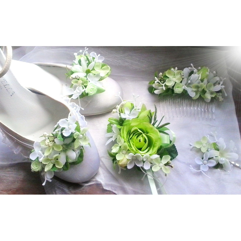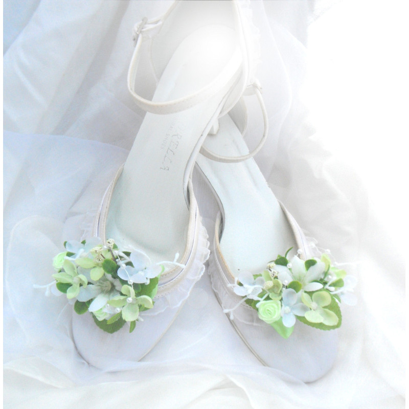 Kovový klip na boty zdobený látkovými květy a perličkami v zelenkavých odstínech. Pokud máte boty z jemného materiálu doporučujeme podložit klip např. kouskem silikonové podložky.