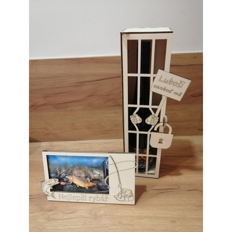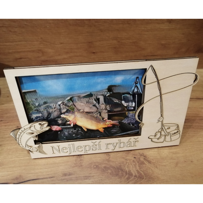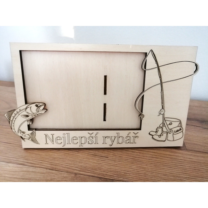 Rámeček na fotografii 10x15cm, z dřevěné překližky s vyřezávaným a gravírovaným rybářským motivem. (Celková velikost cca 24x14cm)
