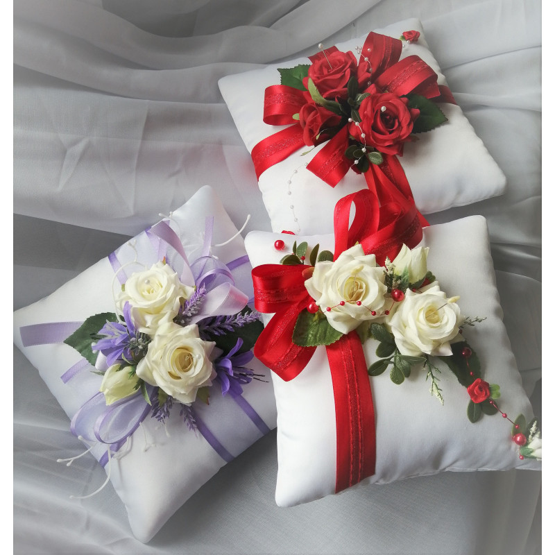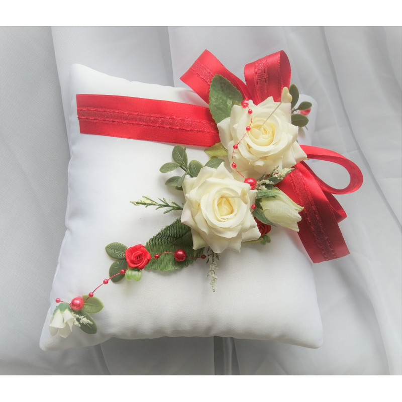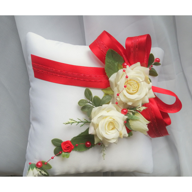 Saténový polštářek bílé barvy, na prstýnky zdobený látkovými růžičkami, perličkami a stuhou.