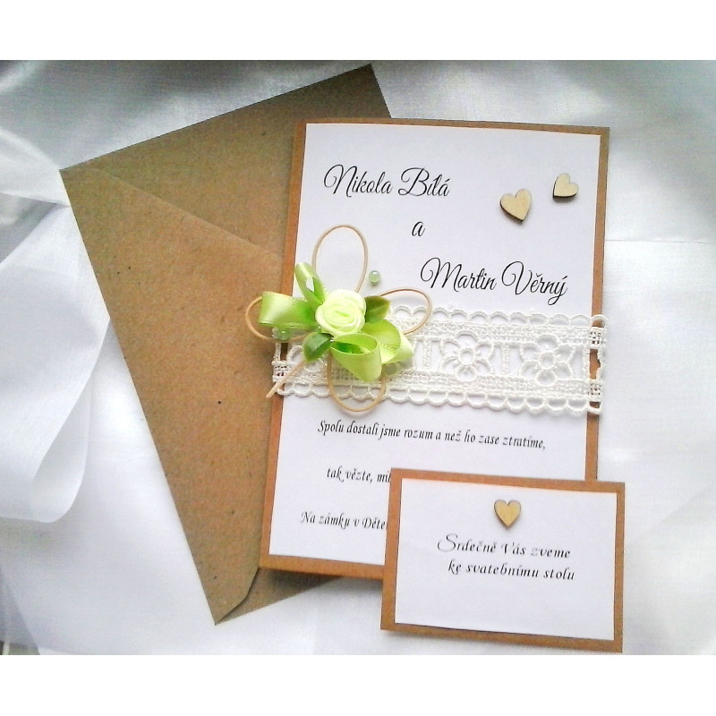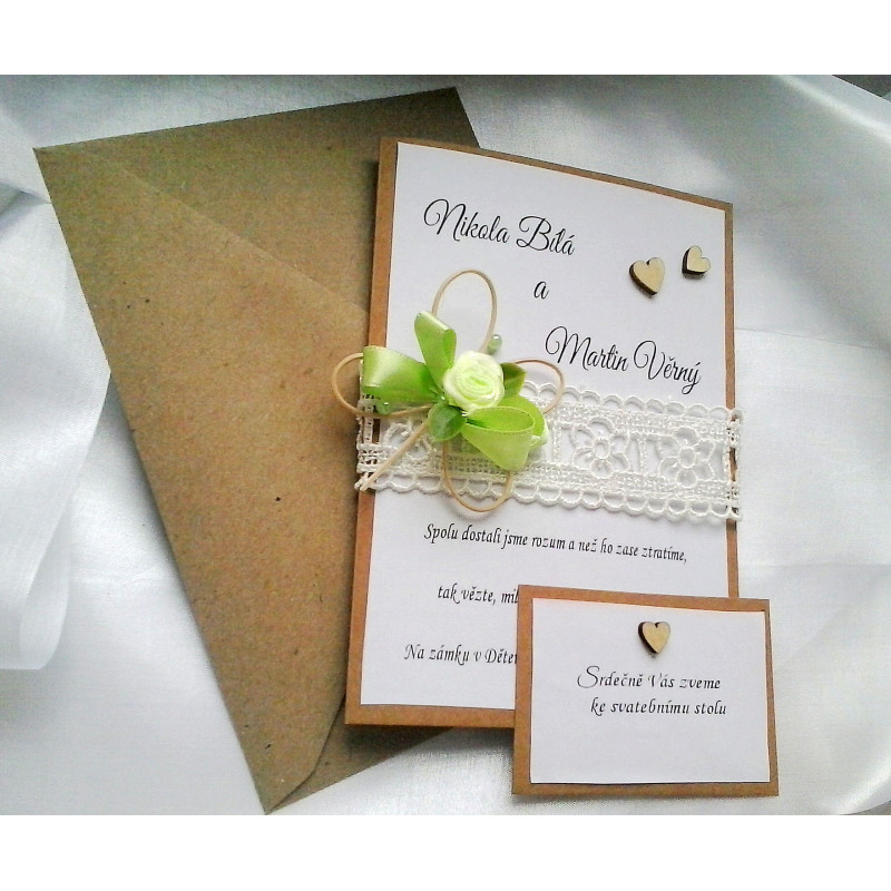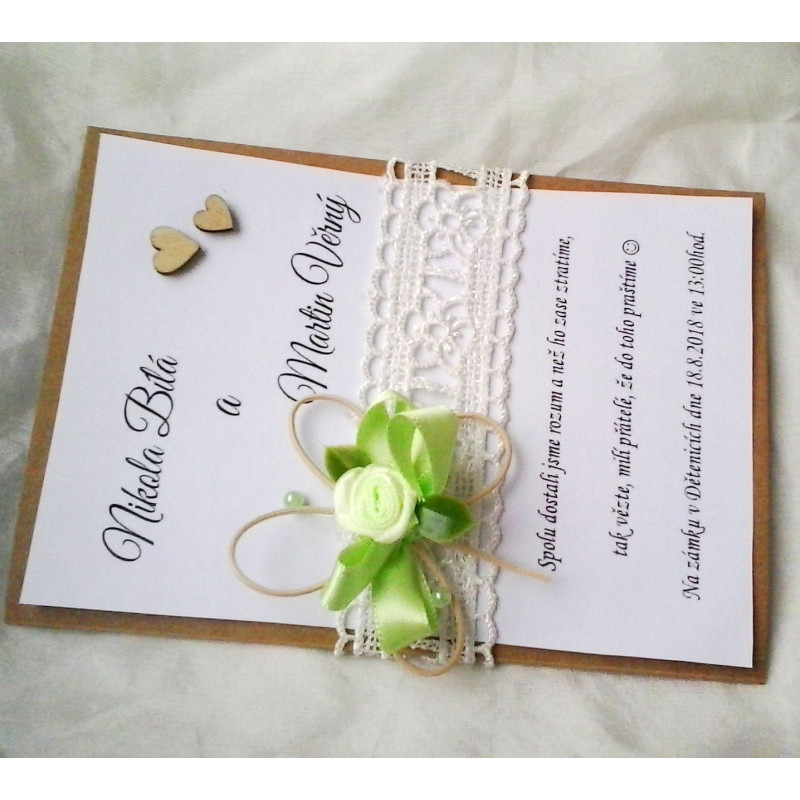 Svatební oznámení v přírodním stylu zdobené krajkou, čtyřlístkem a srdíčky. V současnosti máme jinou krajku, na přání nafotím.