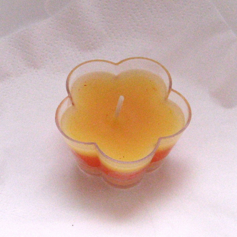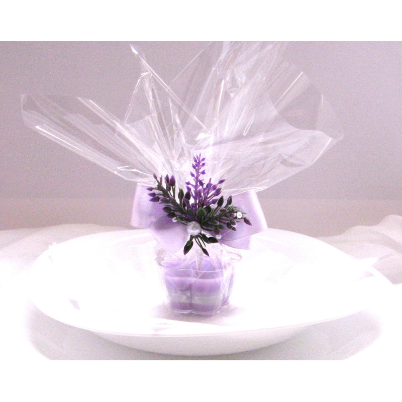 Čajová svíčka ve tvaru květu o rozměru cca 5 x 5 cm v průhledném pevném plastovém obalu.. Barva vosku na přání. Dárkové balení v celofánu s umělou levandulí a atlasovou stuhou je ceně výrobku.