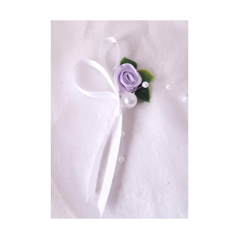 Vývazek z atlasové stužky s atlasovou růžičkou, perličkou a umělým buxusem. Opatřen špendlíkem.