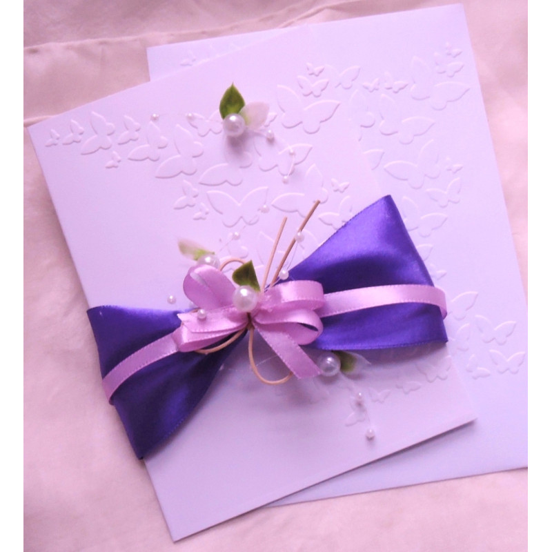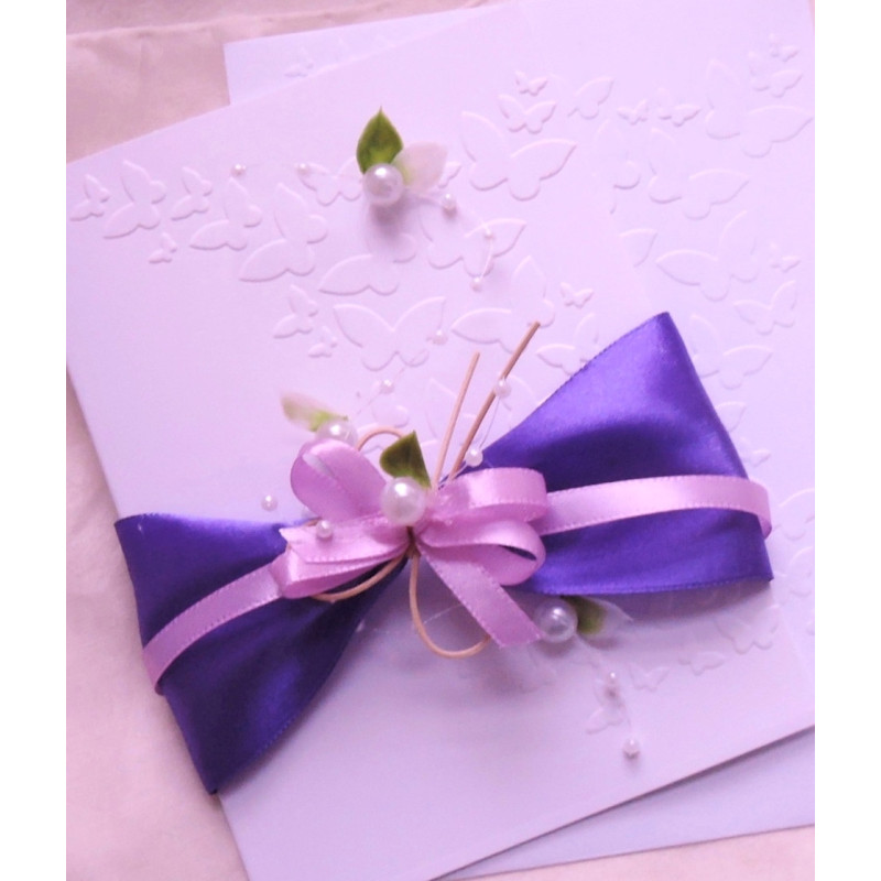 Embosované přání o rozměrech 10,5x14 cm s ratanovým motýlkem, perličkami a umělým buxusem. V ceně bílá obálka.