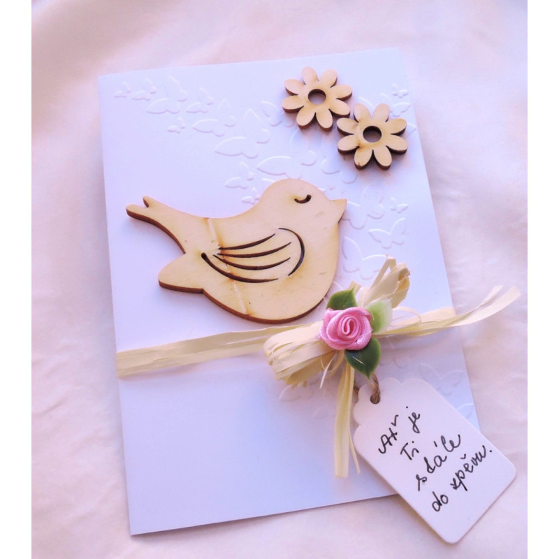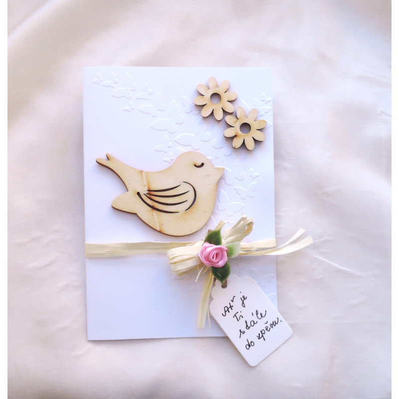 Embosované přání o rozměrech 10,5x cm s dřevěným ptáčkem. V ceně bílá obálka.