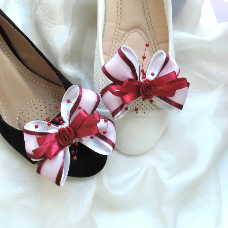 Kovový klip na boty zdobený atlasovými a organzovými mašličkami a perličkami v bílé a vínové barvě. Na všechny velikosti.