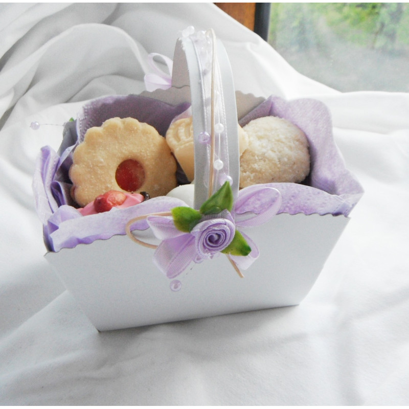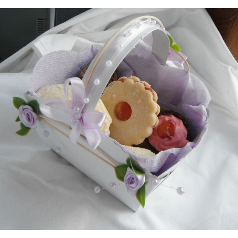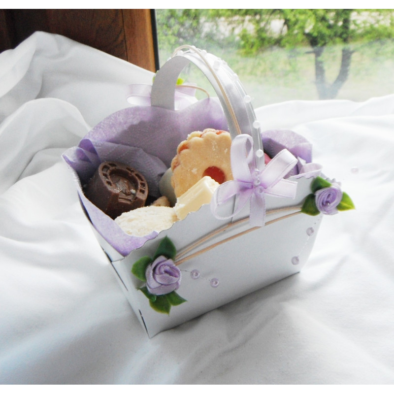 Papírový košíček na menší výslužku zdobený látkovými květinkami, ratanem, stužkou a perličkami. Ubrousek v ceně.