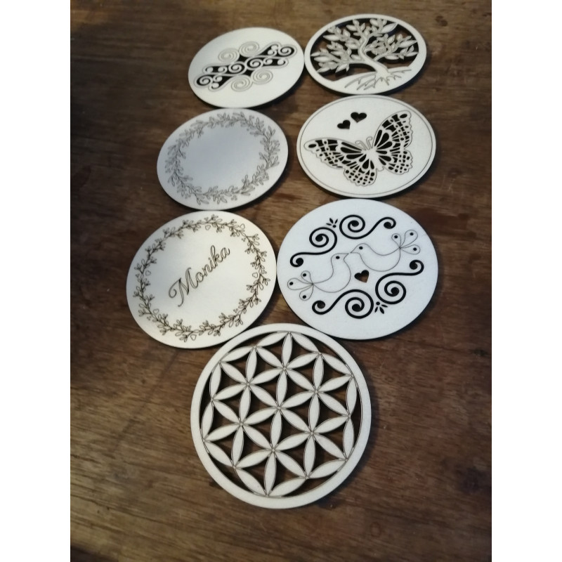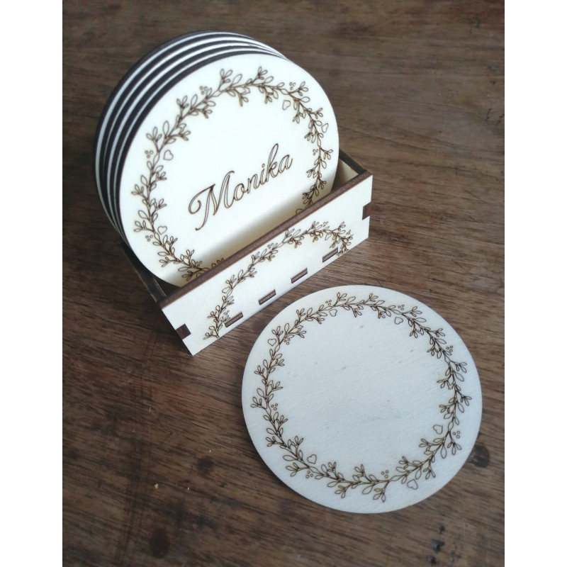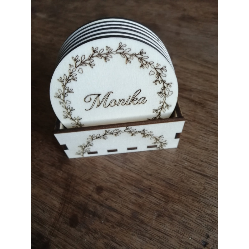 Sada 6 podtácků se stojánkem za zvýhodněnou cenu. Podtácek ze 4mm silné topolové překližky s květinovým ornamentem. Na přání Vám vygravírujeme jména. Podtácky je možné natřít lakem nebo mořidlem +10,-/ks
