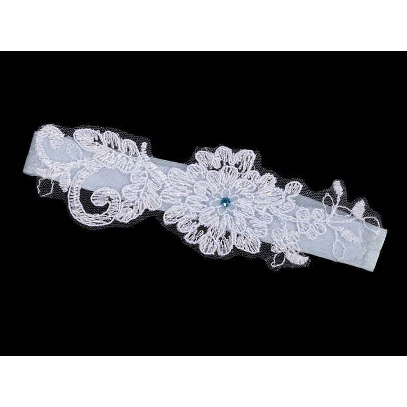 Svatební podvazek je ozdobený romantickou krajkovou aplikací s květem. Květ je ve středu ozdobený třpytivým broušeným kamínkem. Zadní část podvazku pruží, na noze dobře drží.
