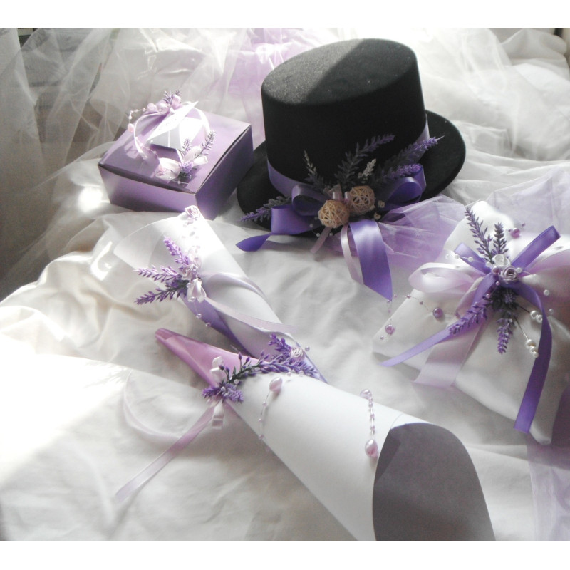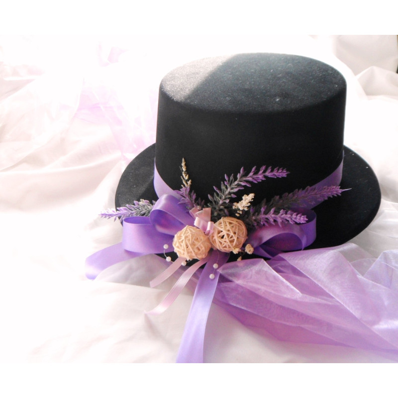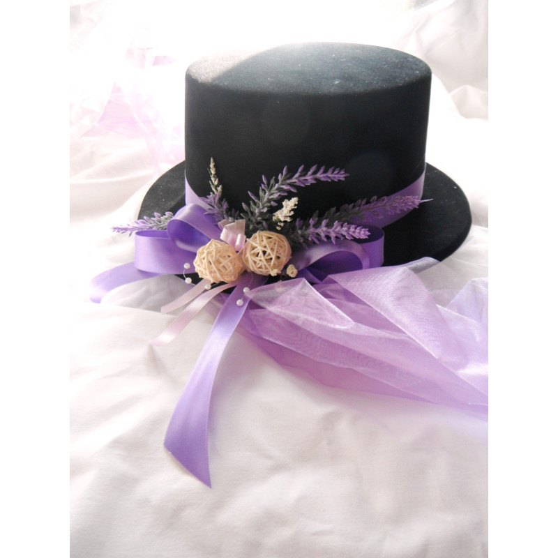 Černý cylindr zdobený stuhou a umělou levandulí. Součástí je šerpa z organzy. Ze spodu jsou přísavky k přichycení na auto.