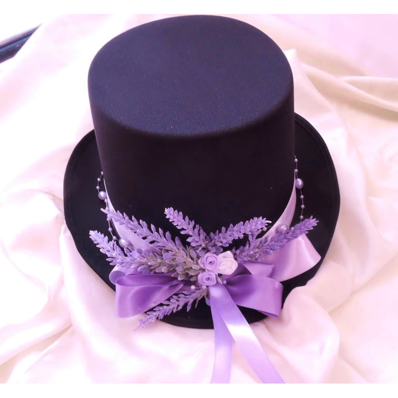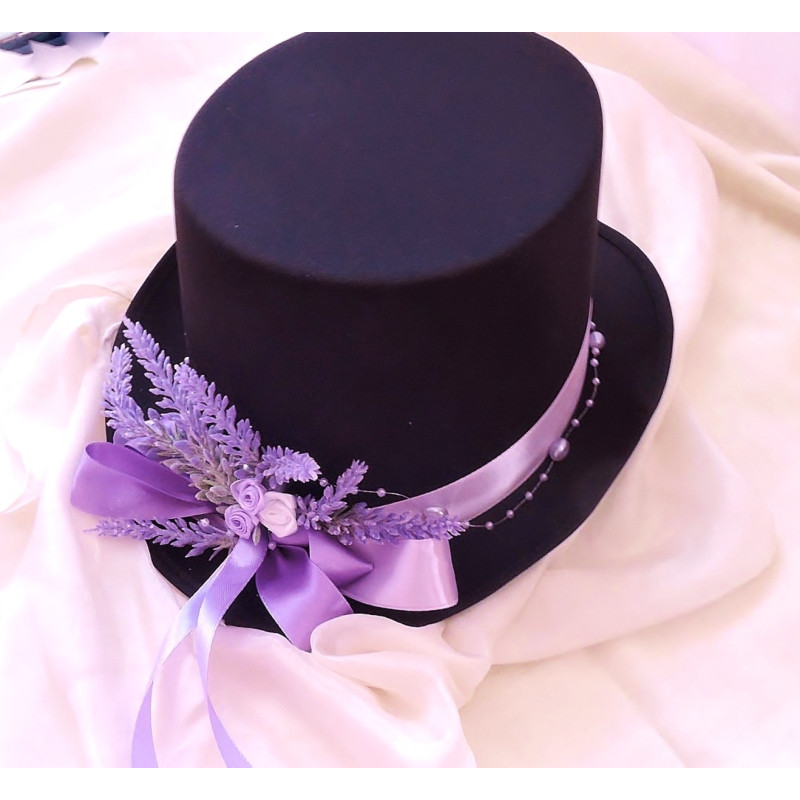 Černý cylindr zdobený stuhou a umělou levandulí.