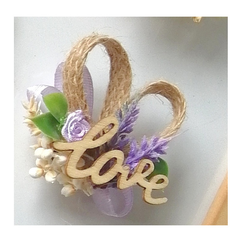 Magnet zdobený jutovým srdíčkem, umělými květinkami a dřevěným nápisem vhodný jako dárek pro Vaše svatební hosty