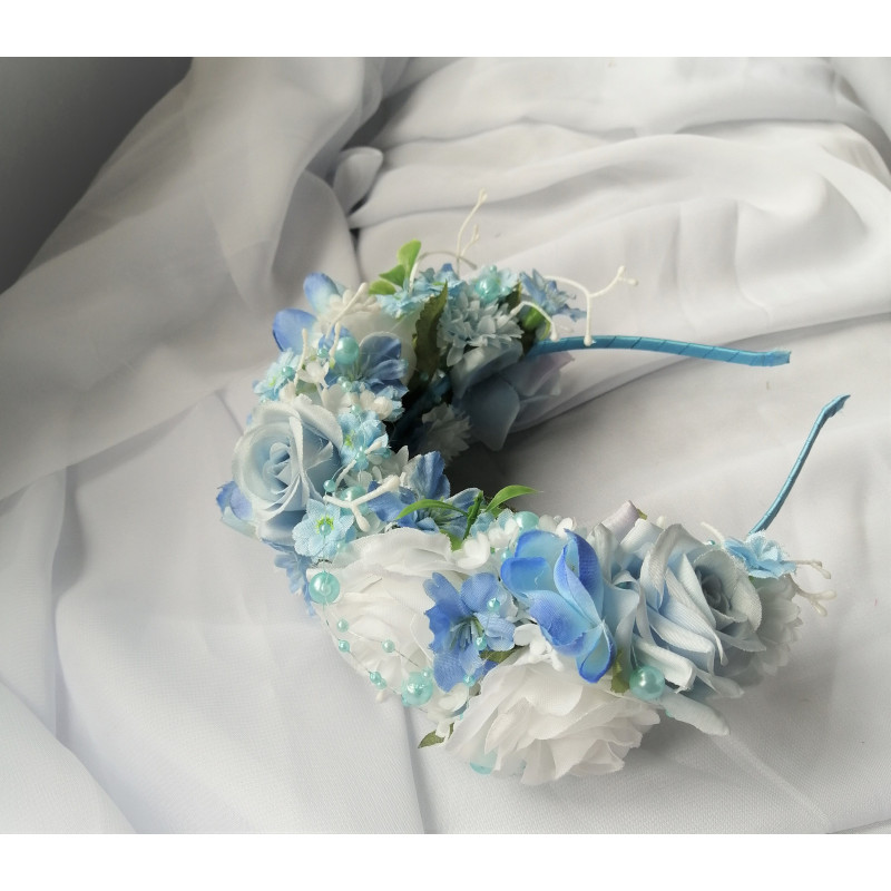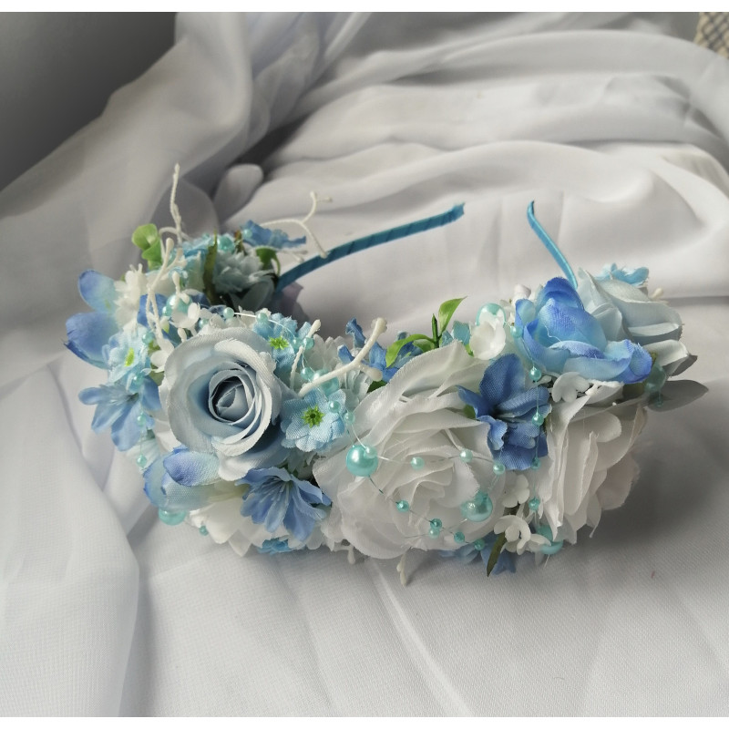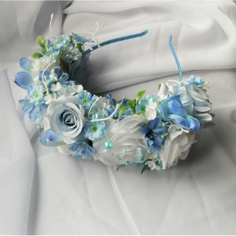 Čelenka do vlasů z látkových kvítků v bílé a modré barvě.