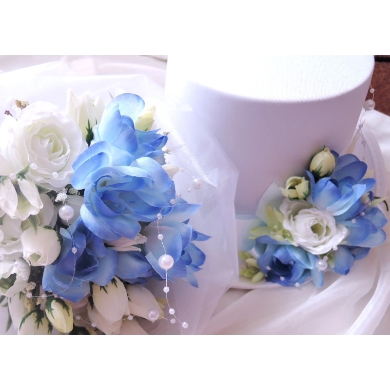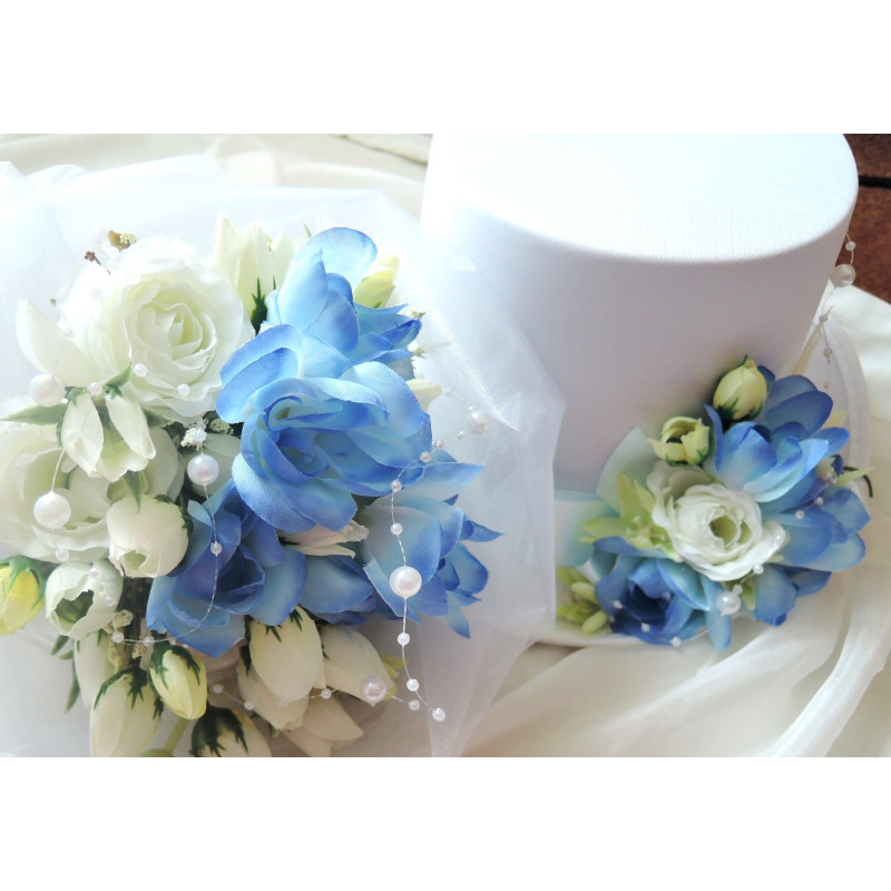 Kytice látkových květů opatřená přísavkami a cylindr ve stejném stylu. Kytice na fotce je jen lehce naaranžovaná. Konečnou úpravu lze vidět na podobném výrobku - s orchidejí.