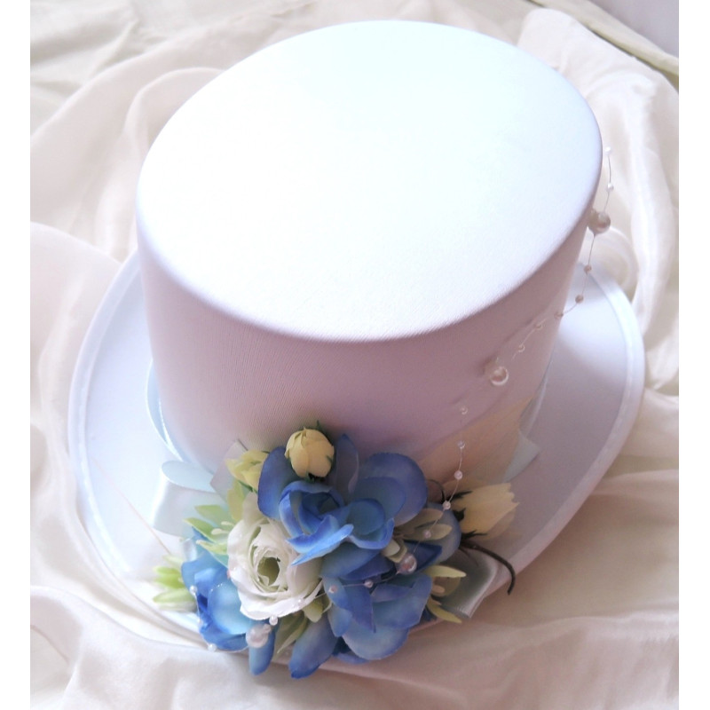Kytice látkových květů opatřená přísavkami a cylindr ve stejném stylu.