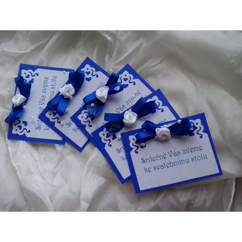 Pozvánka ke svatebnímu stolu ze dvou pevného papíru s vyřezaným motivem.Zdobeno mašličkou a růžičkou . Na přání i v jiné barevné kombinaci. Velikost 5x7cm