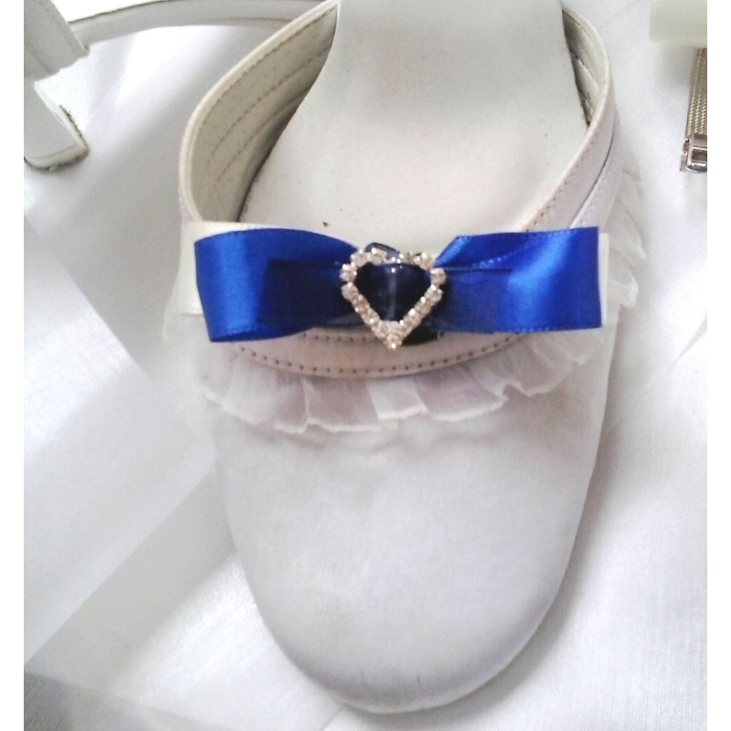Kovový klip na boty zdobený stuhami v modré a ivory barvě a štrasovým srdíčkem. Pokud máte boty z jemného materiálu doporučujeme podložit klip např. kouskem silikonové podložky.