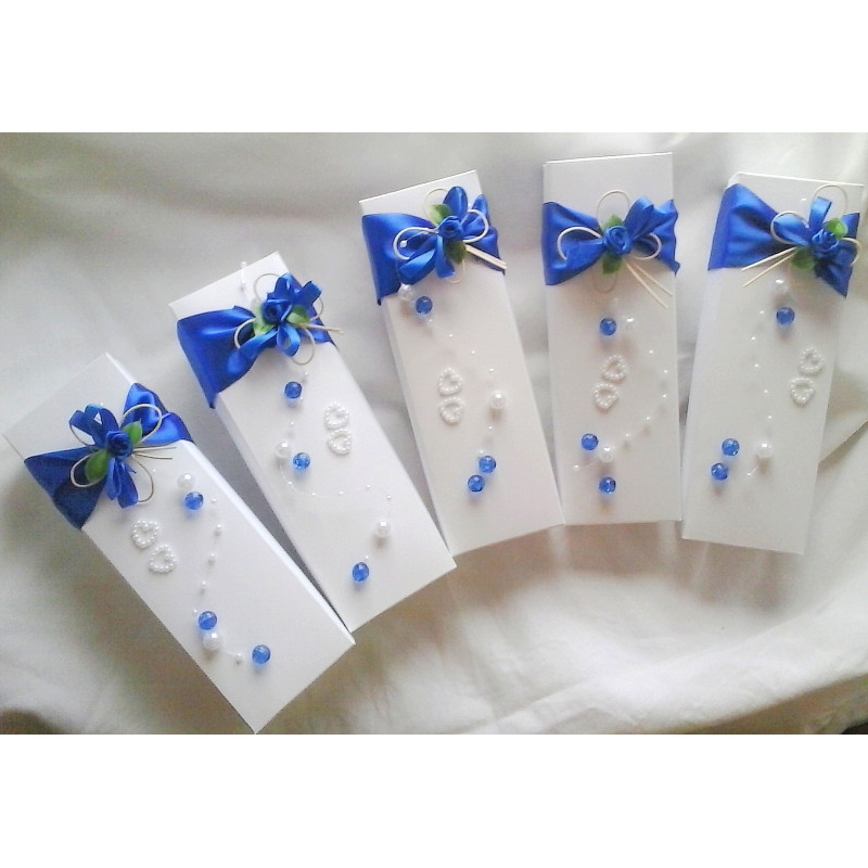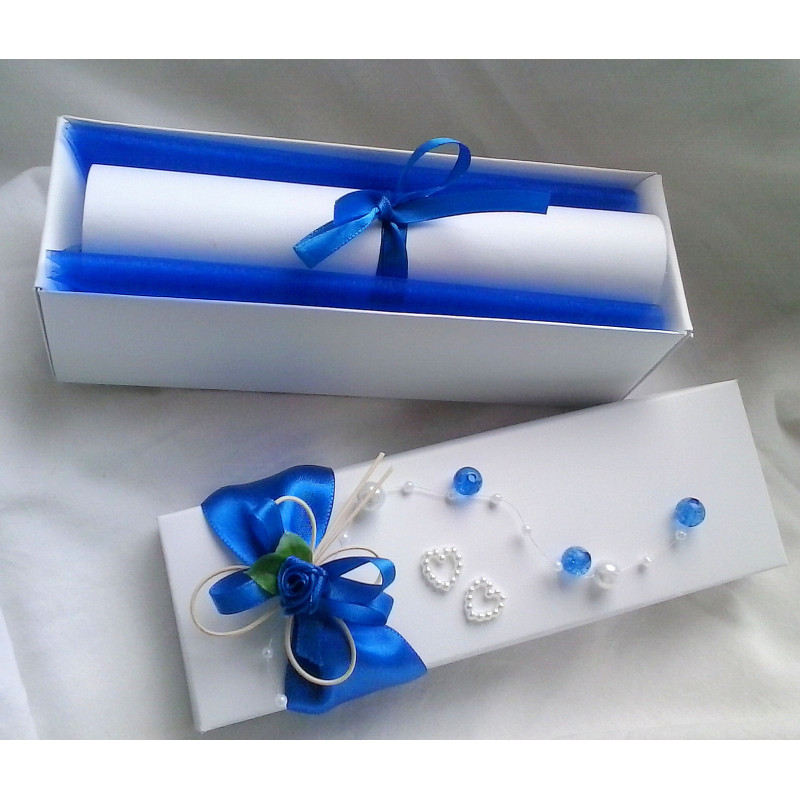 Vnitřek krabičky je vyložený organzou, oznámení s jednoduchým vyřezaným ornamentem, zdobené perličkovým srdíčkem nebo květinkou. Oznámení je stočené do ruličky a převázané atlasovou stuhou. Vrch krabičky je zdobený atlasovou stuhou, ratanovým motýkem, perličkami a srdíčky.