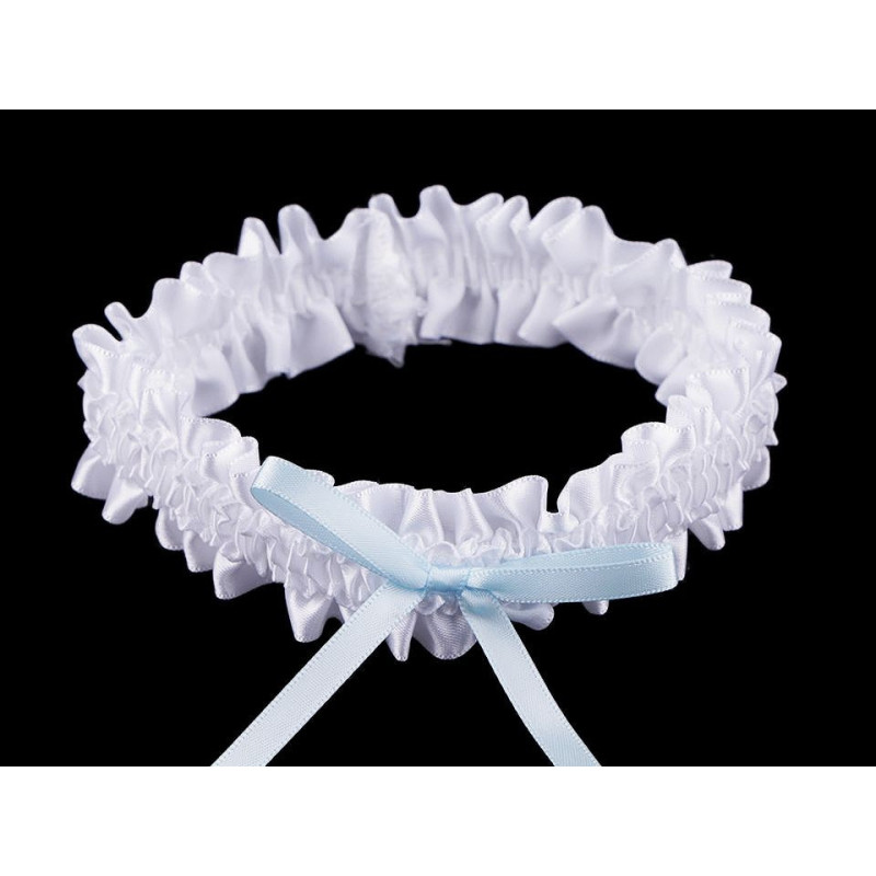 Saténový svatební podvazek zdobí mašlička. Podvazek dobře pruží a příjemně se nosí. Je zabalený v průhledné dárkové krabičce se závěsem.