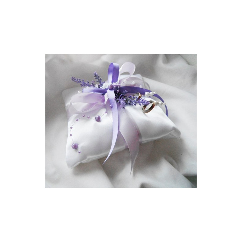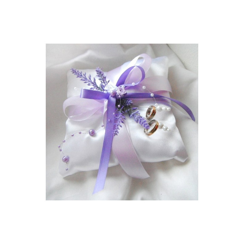 Saténový polštářek bílé barvy, na prstýnky zdobený umělými levandulemi, perličkami a stuhou.