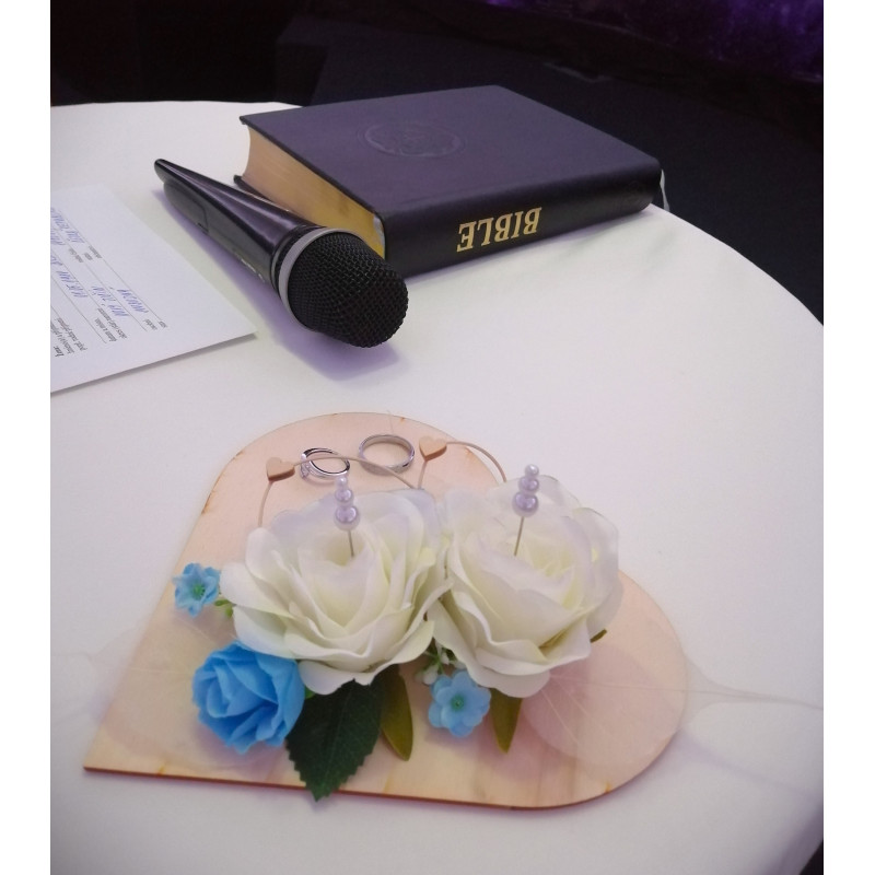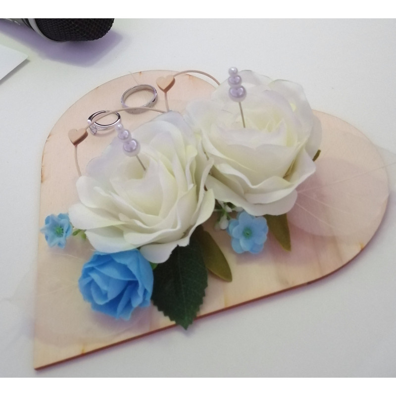 Podložka pod prstýnky- srdíčko vyřezané z překližky zdobené látkovými květy. Srdíčko cca. 18x18cm