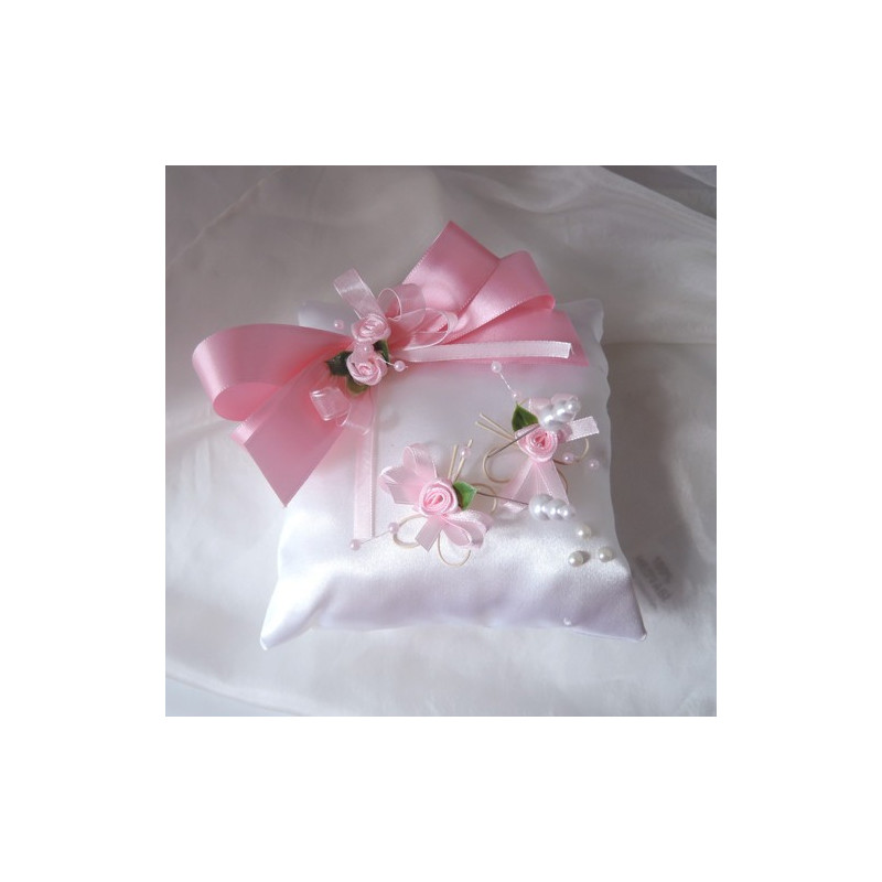 Saténový polštářek na prstýnky zdobený ratanovými motýlky, perličkami, atlasovou mašlí a stuhou.