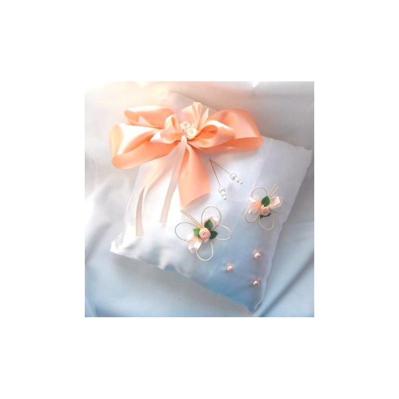 Saténový polštářek na prstýnky zdobený ratanovými motýlky, perličkami, atlasovou mašlí a stuhou.