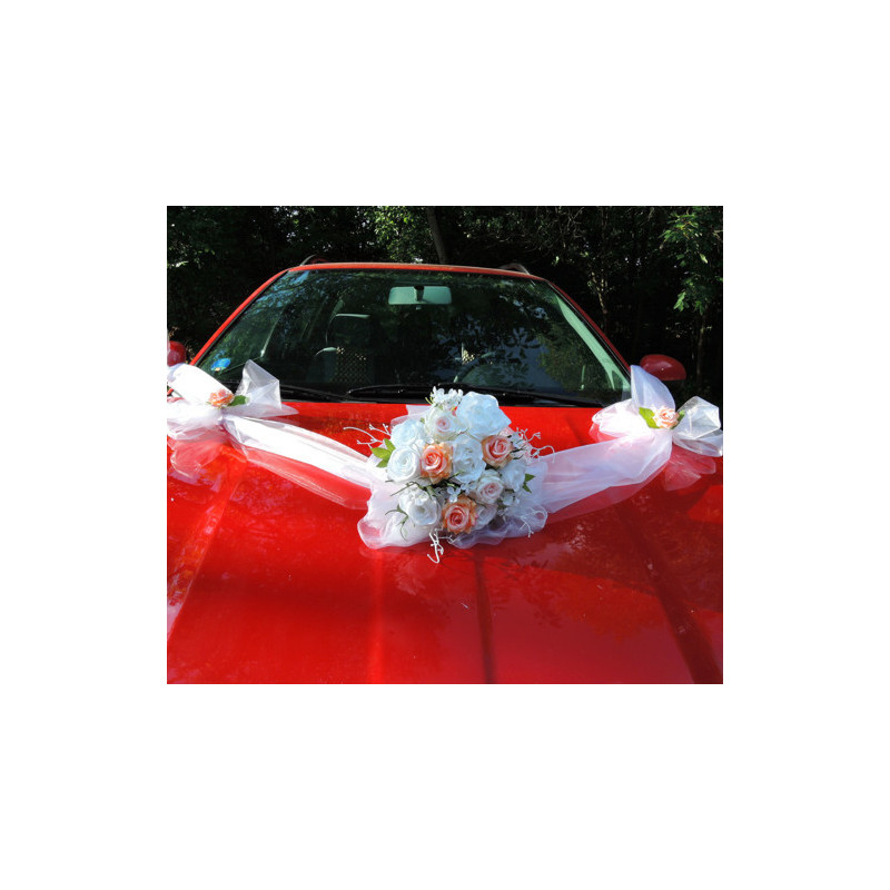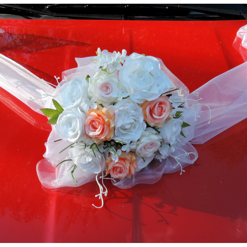 Kytice látkových květů v kombinaci bílé s meruňkovou a lososovou, opatřená přísavkami. Součástí je šerpa se dvěma mašlemi a kytičkami. Šerpa (široká organza 9 m) .