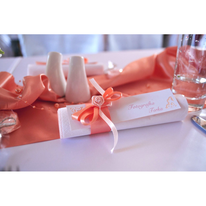 Látkový kroužek na ubrousky s atlasovou stužkou a růžičkou, Jmenovka je volně zasunutá pod stužku. Ubrousky v ceně. Dodáváme již upravené jako na fotografii.
