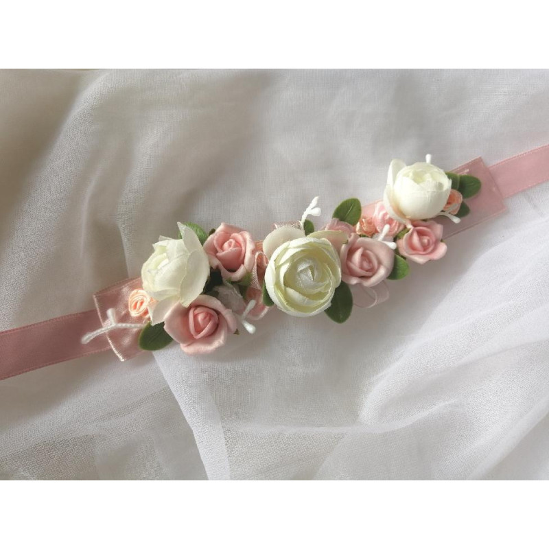 Látkový náramek s látkovými a umělými květinkami v růžových a meruňkových tónech.