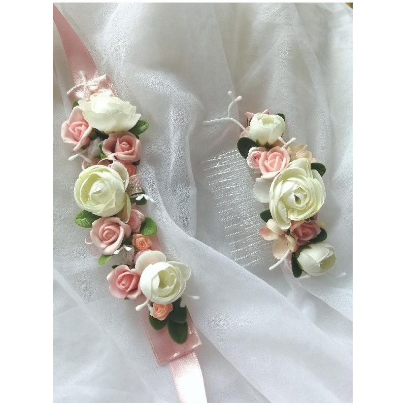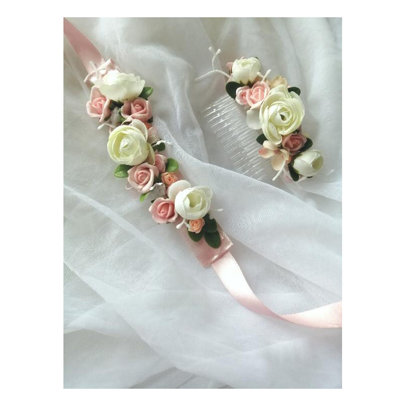 Průhledný hřebínek do vlasů zdobený látkovými kvítky.