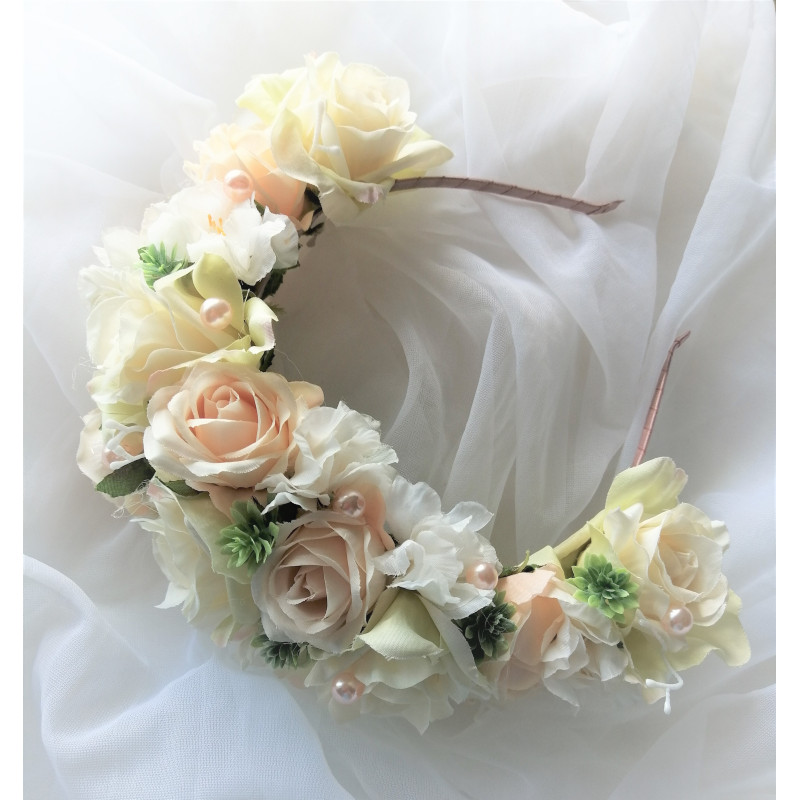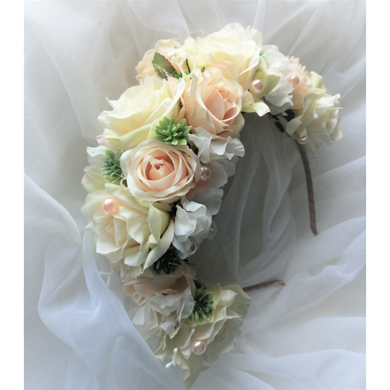 Čelenka do vlasů z látkových kvítků v meruňkových tónech.