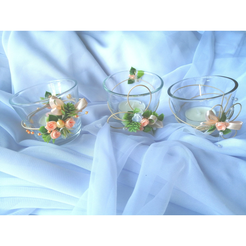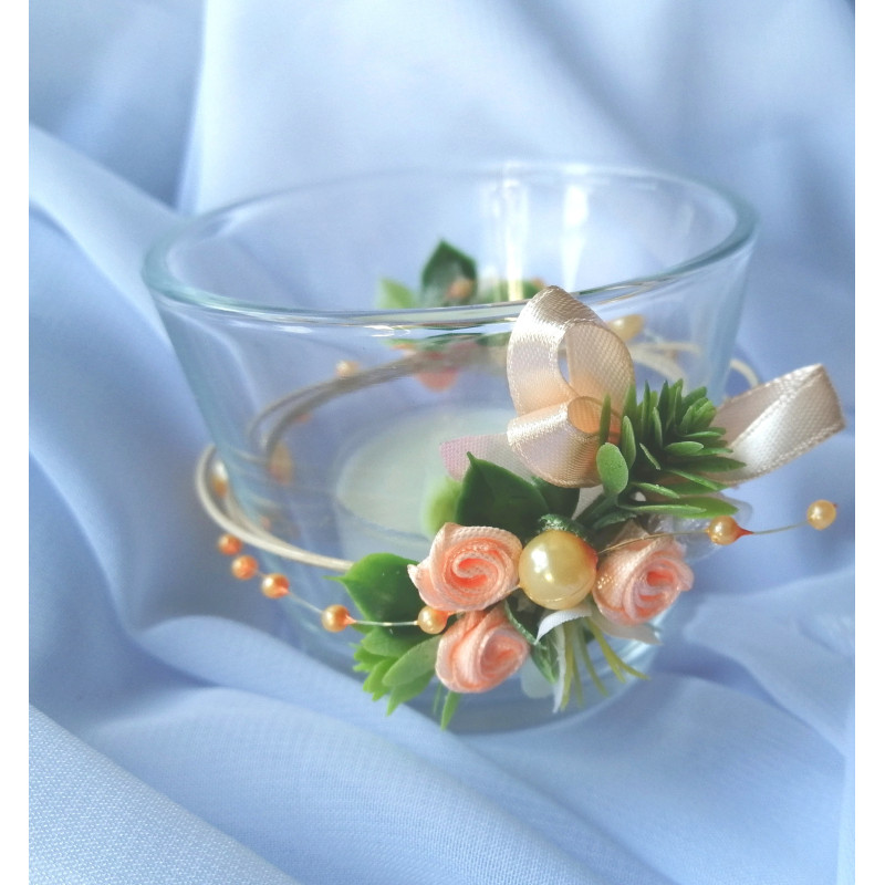 Skleněný svícínek v meruňkovobílé barvě. Dodáváme včetně vonné čajové svíčky. Krásná dekorace Vašeho slavnostního stolu.