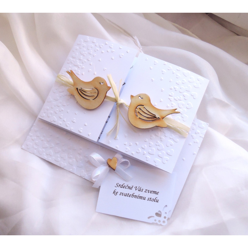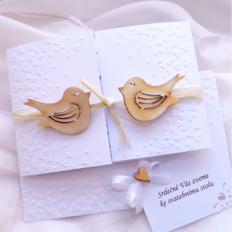 Embosované svatební oznámení o rozměrech 14x10,5 cm (složené) s dřevěnými ptáčky.