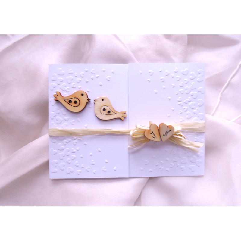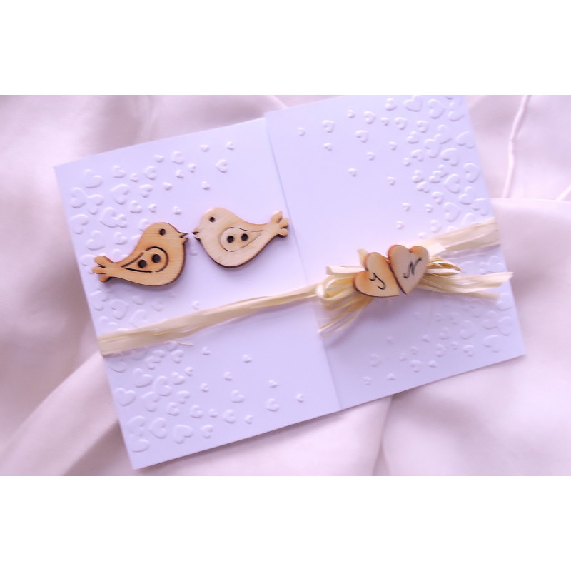 Embosované svatební oznámení o rozměrech 14x10,5 cm (složené) s dřevěnými ptáčky.