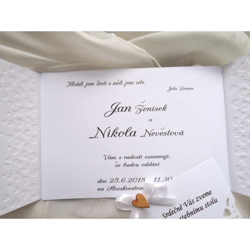 Embosované čtvercové svatební oznámení (strana13,5 cm) s dřevěnými ozdobami. Nabízíme embosovanou...
