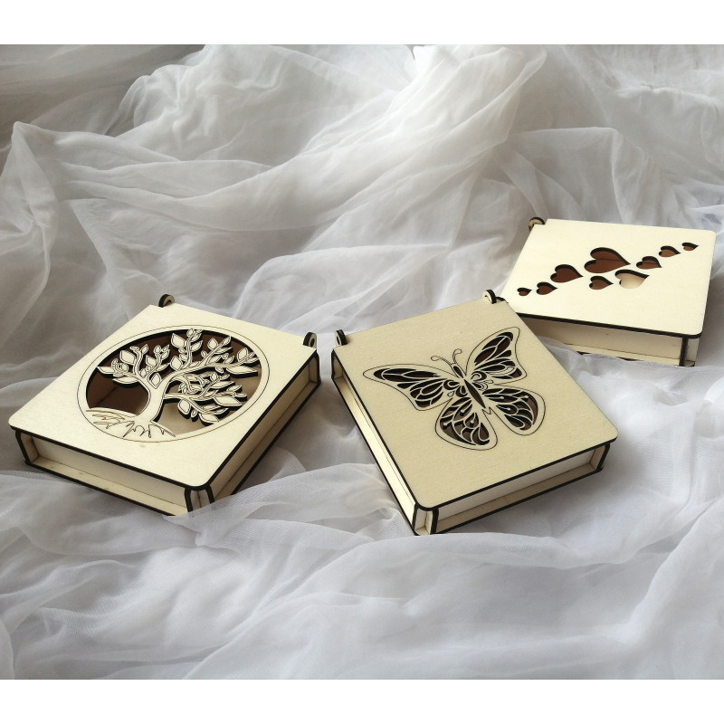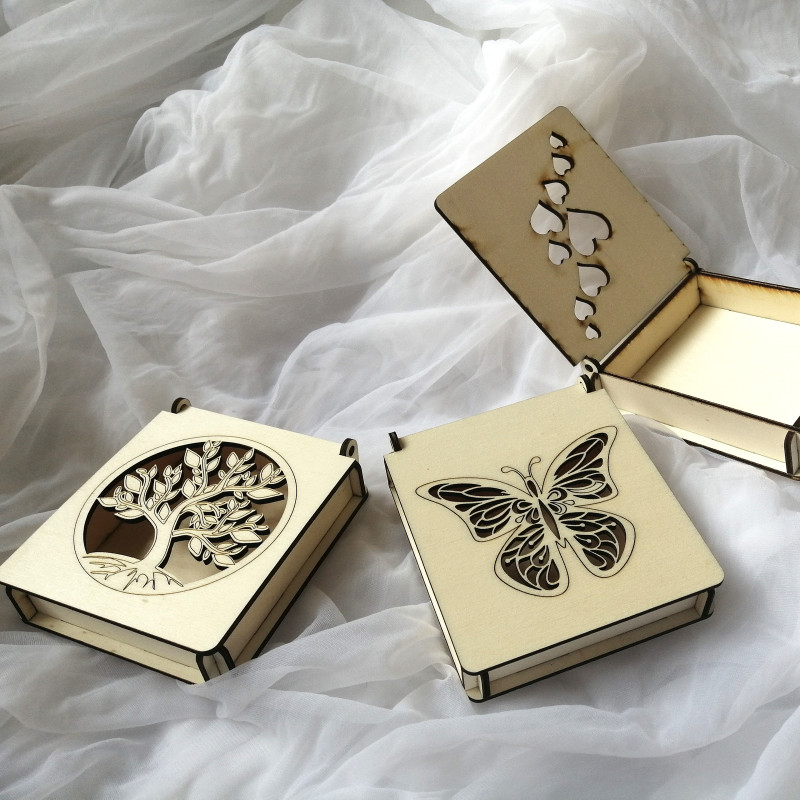 Malá dřevěná dárková krabička z topolové překližky o síle 3mm s prořezávaným motivem.