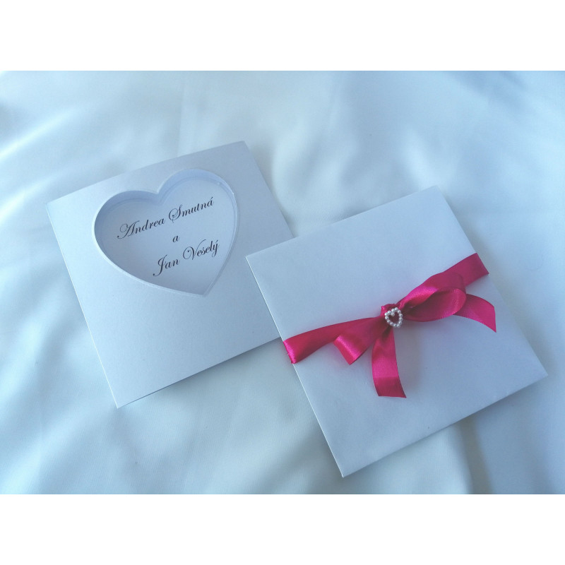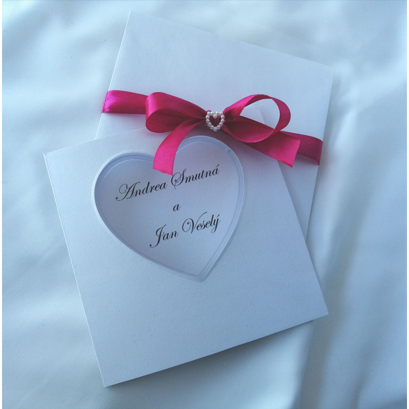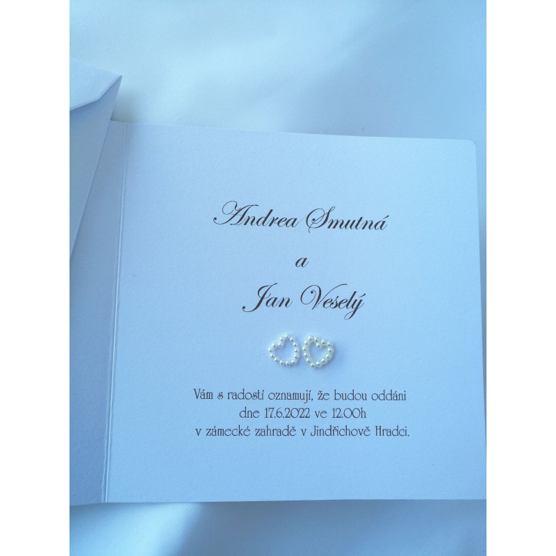 Svatební oznámení ve tvaru čtverce, otevírací, uvnitř zdobené perličkovými srdíčky. Oznámení zdobí vyřezaný ornament ve tvaru srdce, který zdůrazní jména. Součástí je tisk textu na Vaše přání a obálka saténovou stuhou. (stuhu je možné vyměnit za jinou barvu)