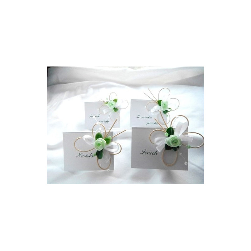 Svatební jmenovky s ratanovým motýlkem zdobeným látkovou růžičkou, umělým buxusem a perličkami dozdobí Váš svatební stůl. Vyrobeny z pevného papíru.