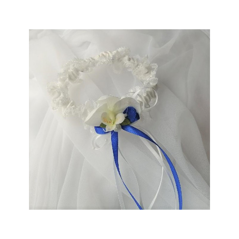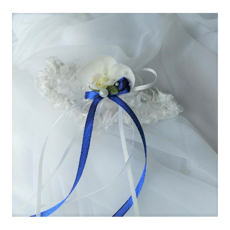 Svatební podvazek z jemné krajky s modrou saténovou mašličkou, zdobený látkovou orchidejkou a perličkou. Dobře pruží, příjemně se nosí. Je zabalený v průhledné dárkové krabičce se závěsem.