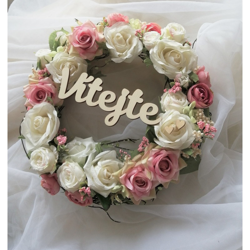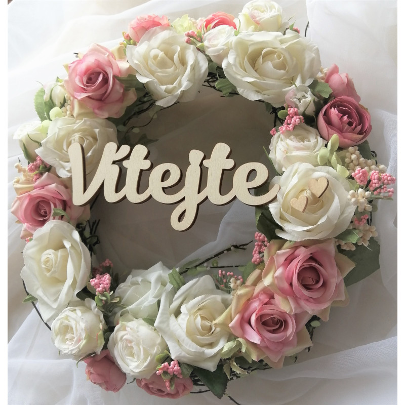 Věneček z jemného proutí zdobený látkovými růžičkami a dřevěným nápisem. Průměr cca. 25cm