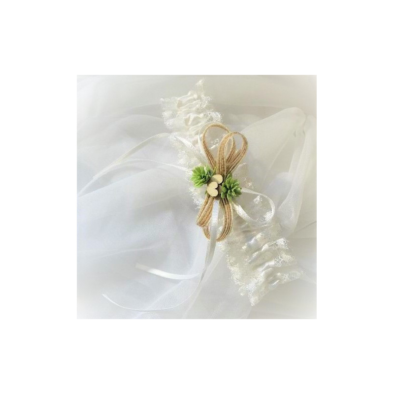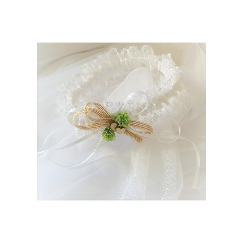 Svatební podvazek z jemné krajky s jutovou mašličkou, zdobený umělými lístky a dřevěnými srdíčky. Dobře pruží, příjemně se nosí. Je zabalený v průhledné dárkové krabičce se závěsem.