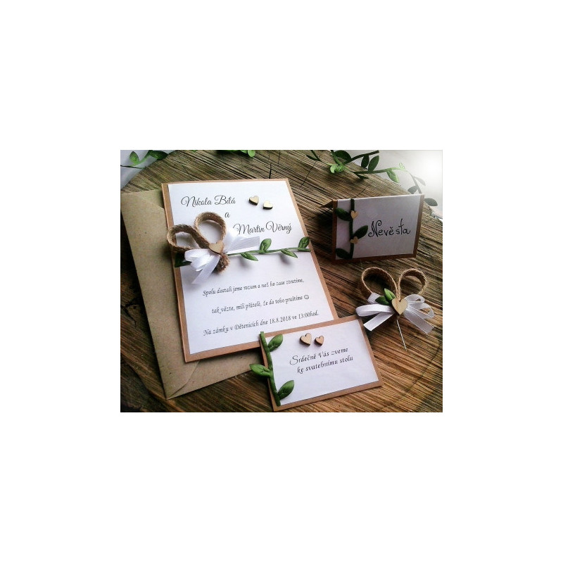 Svatební oznámení na kraftovém papíře zdobené jutovým srdíčkem a látkovými lístky. rozměry: 14,5...