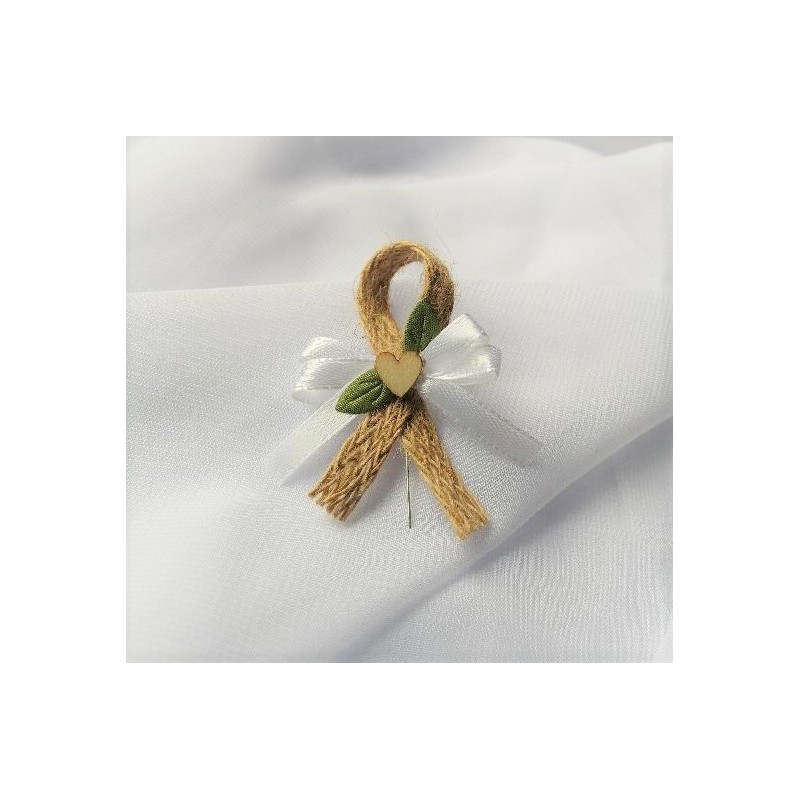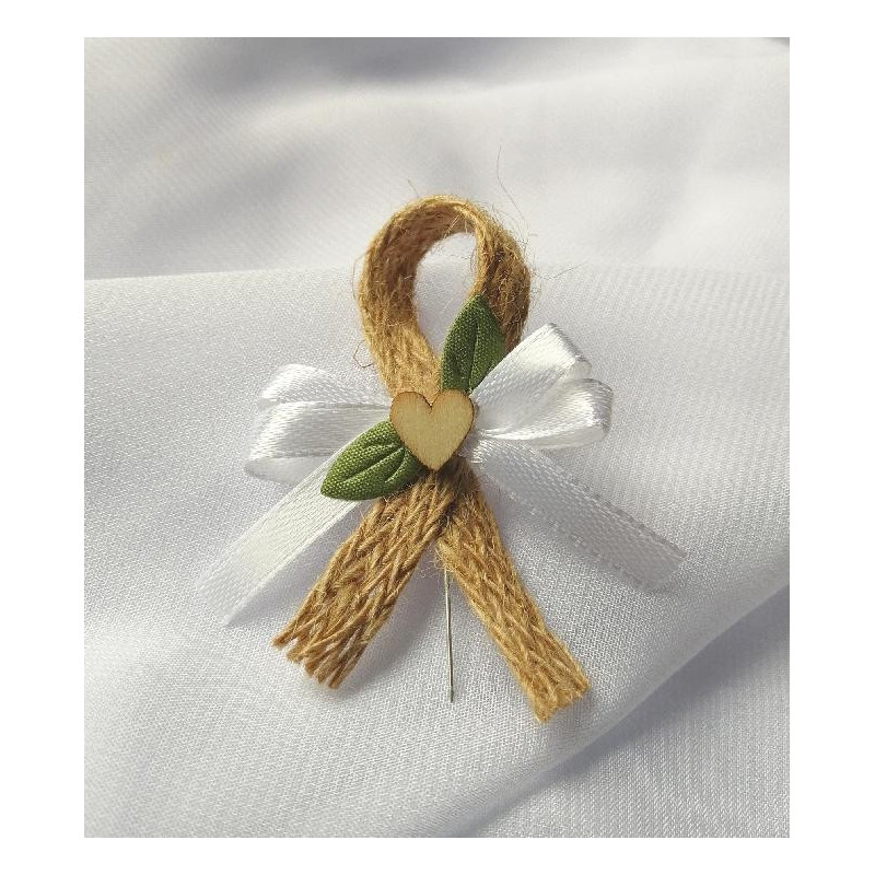 Jutový vývazek o rozměru cca 4x5 cm s atlasovou stužkou, dřevěným srdíčkem a látkovými lístky.