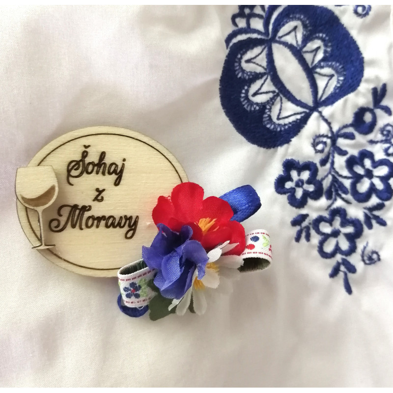 Originální dřevěná brož s nápisem šohaj nebo holka z Moravy zdobená látkovými květinkami a stuhami ve folkorním stylu.