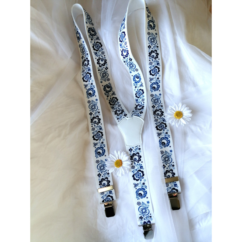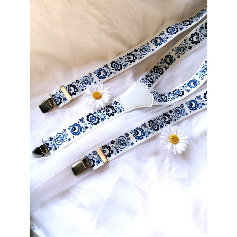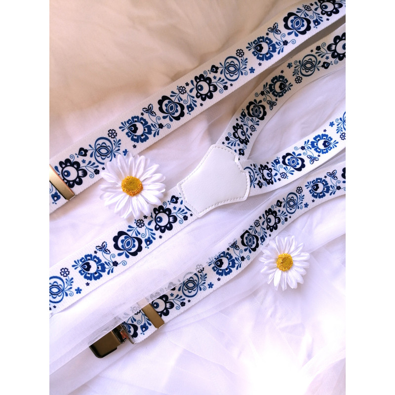Folklorní kšandy v bílé barvě s modrým květinovým vzorem