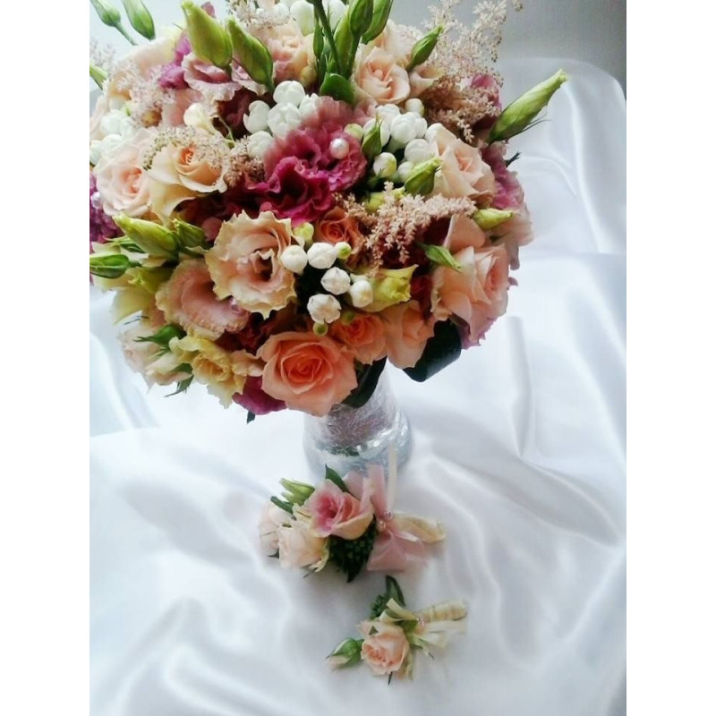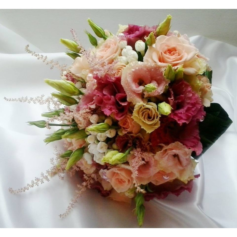 Svatební kytice z eustomy, trsových růžiček a astilbe.