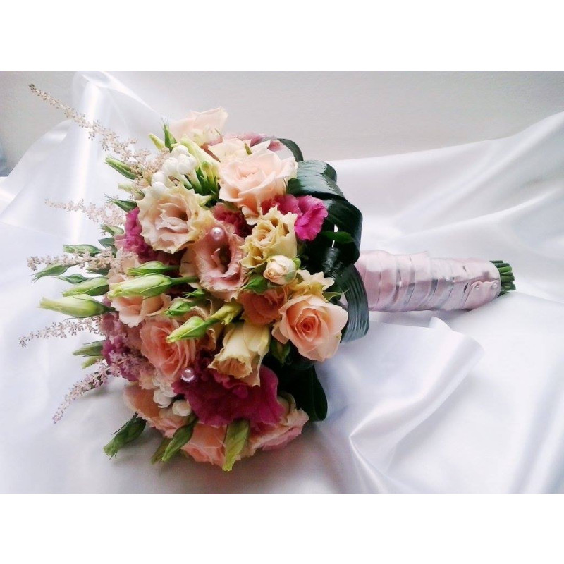 Svatební kytice z bílých a růžových růží, kal,eustomy a frézií.